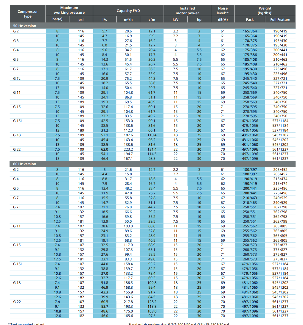 - Atlas Copco compressors are legendary for their reliability and efficiency. That is why our G series has long been the preferred air solution for small and medium-sized businesses. The G 2-7 VSD, the G 2-7, the G 7L-15, and the G 15L-22 simply check all the boxes.